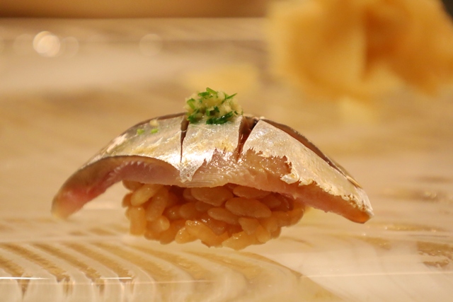 サンマ。 ネギと生姜が乗せられた一貫。脂がのったサンマと薬味のバランスが良く、秋の味覚を存分に感じられます。