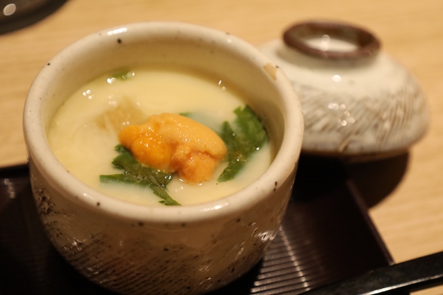 茶碗蒸し。雲丹がたっぷり乗った、濃厚で贅沢な茶碗蒸し。とろけるような滑らかさでした。