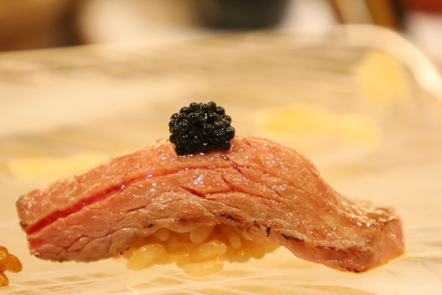 炙り神戸牛キャビア乗せ。口の中でとろける炙り神戸牛に、キャビアの塩気がアクセント。最高に贅沢な組み合わせです。