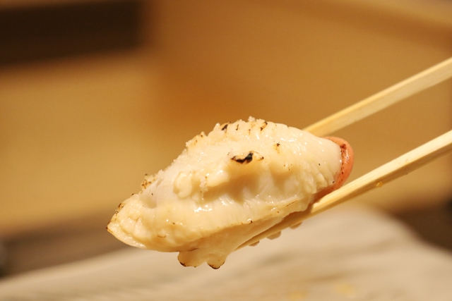 ホッキ貝の炙り。香ばしい香りとホッキ貝独特の食感が楽しめる一貫。