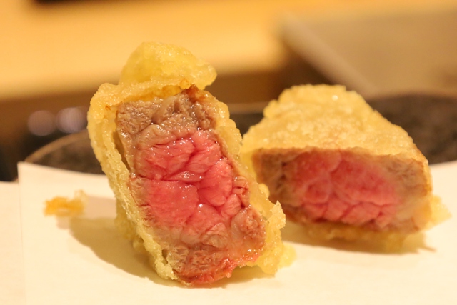 神戸牛特選部位天ぷら。お好みで柚子胡椒や梅塩につけていただきます。肉の旨みが口いっぱいに広がり、これもまた絶品です。