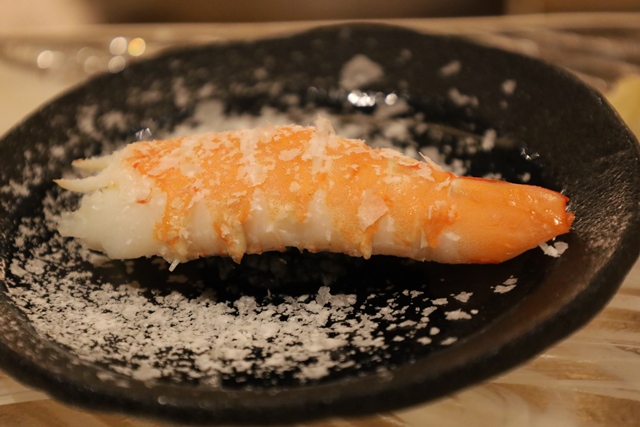 天使の海老の握り。塩が振られており、海老本来の甘みが引き立ちます。