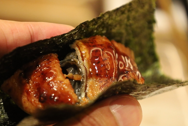 鰻の蒲焼。海苔の上にのせられ、手渡しで提供されます。香ばしい鰻とシャリのバランスが最高の一貫。