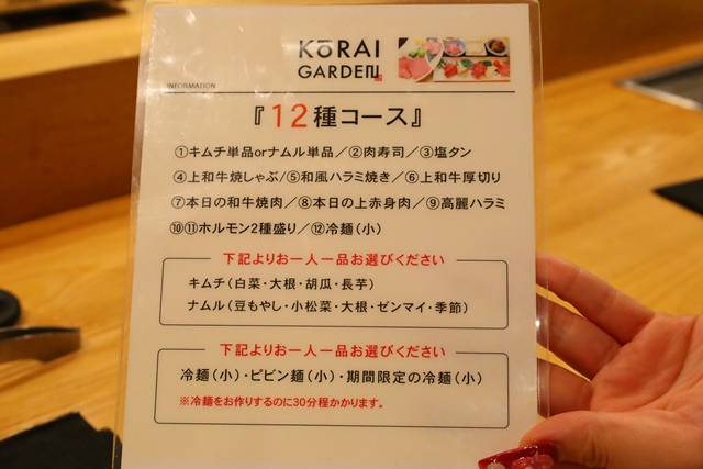 今回いただいたのは、当日おすすめのお肉を少しずつ堪能できる「おまかせ12種コース(税込5,500円)」。肉寿司や冷麺まで付いた、迷ったらこれ!な王道コースの内容をまとめました。