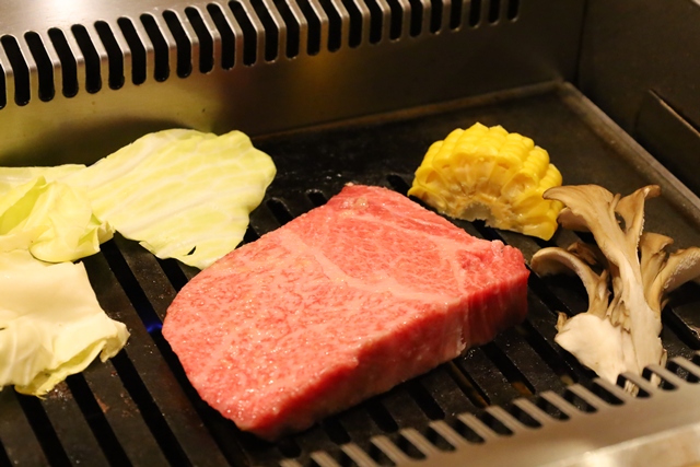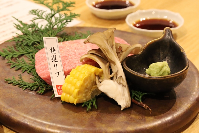 中盤、さらに贅沢な逸品が続きます。 まずは特選リブ。トウモロコシとエノキと共に、美しいお皿に山葵を添えて提供されました。