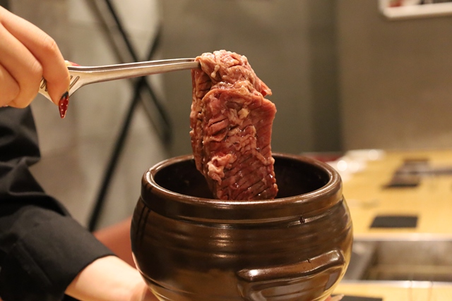 壺の中から現れたのは、秘伝のタレに丸2日間漬け込まれた、大きく分厚いハラミ!