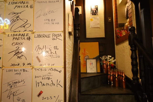階段には著名人のサインがずらりと並んでいます。店内は木のぬくもりを感じるカジュアルな雰囲気で、お一人様からお子様連れのファミリーまで、誰でも気軽に利用できる空間です。