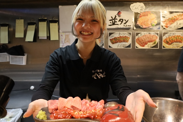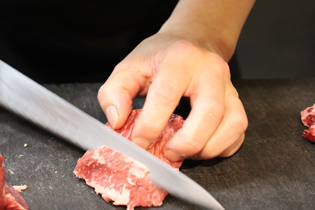 私たちが座ったカウンター席では、目の前でプロの職人さんがお肉を切り分けている姿が丸見え!包丁の音やお肉の鮮やかな赤色が、食欲をそそる最高のライブ感を演出してくれます。思わず動画を撮ってしまいました!