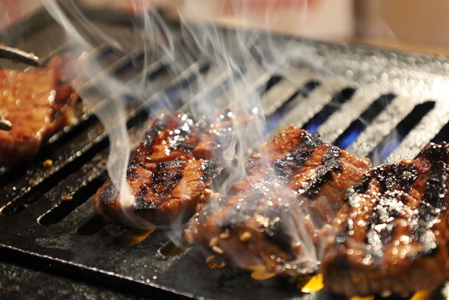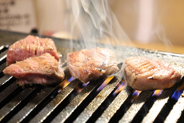 美しいサシが全体に入った、見るからに上質な逸品!長年の目利きで選ばれた肉の迫力に圧倒されます。これをロースターの上で丁寧に焼いていくと、ジューシーな脂が溶け出し、香ばしい香りが立ち込めます。