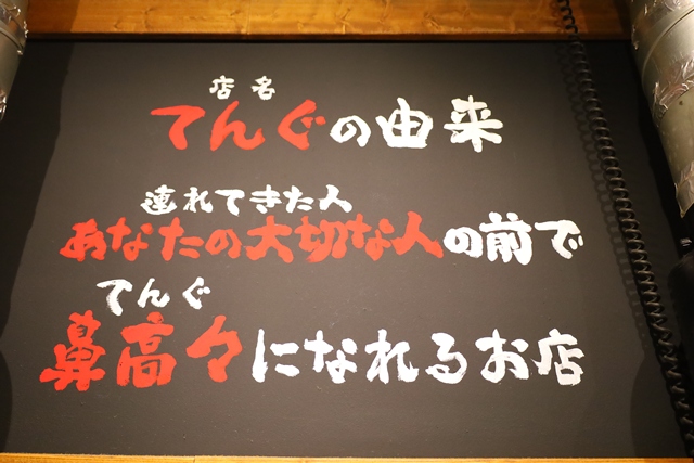 店名の「てんぐ」には、「連れてきた大切な人の前で、鼻高々(てんぐ)になれる店」という意味が込められているそう。「いいお店あるで!」と友人を誘える、自信を持てるお店だということです。