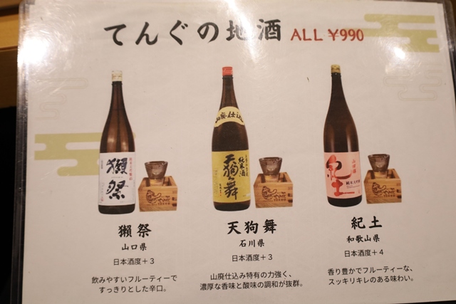 日本酒は、獺祭、天狗舞、紀土など、こだわりのラインナップ。