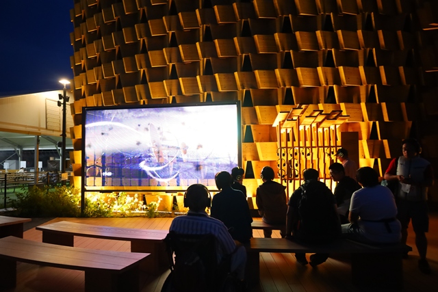 パビリオンの外にあるテラス席では、ヘッドフォンをつけて映像を楽しむこともできます。