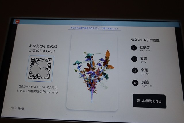 パネルのカードをタップして好きな花や心を選択していくと、「あなたの花の個性」が完成。QRコードをスキャンすれば、自分だけの植物をスマートフォンに保存できます。