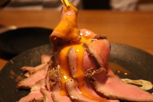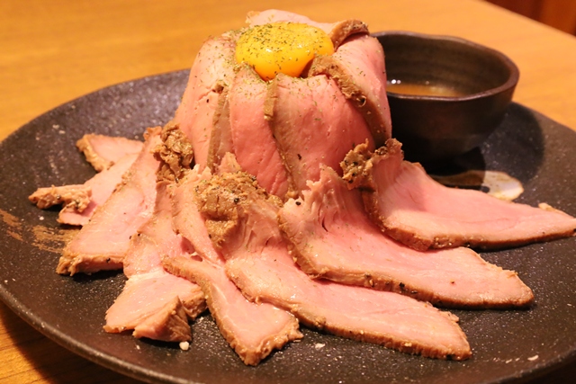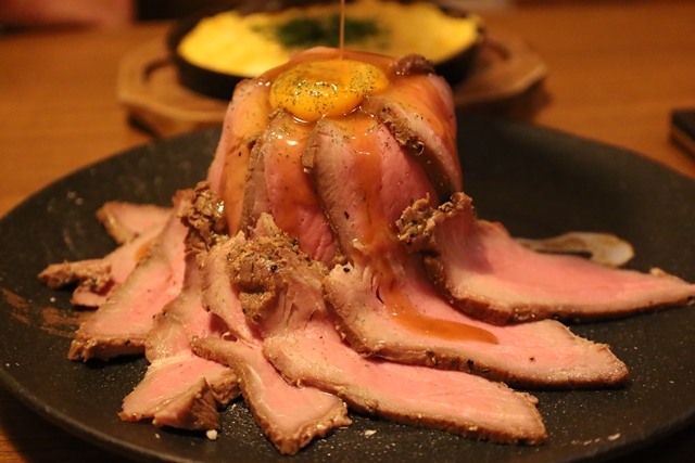 運ばれてきた瞬間、その名の通りの迫力に驚きました!山盛りのローストビーフの中にはポテトサラダがぎっしり。濃厚なウニソースと卵黄を絡めていただくと、肉の旨味が引き立ち、食べ応え抜群です。