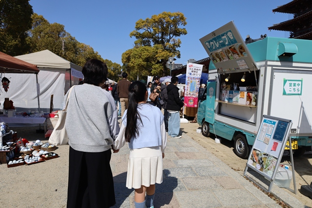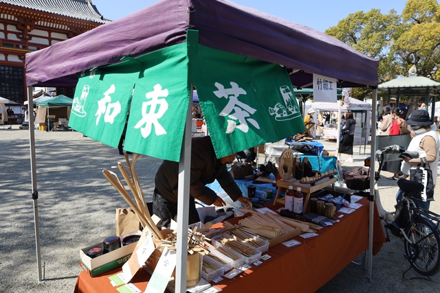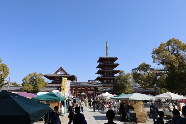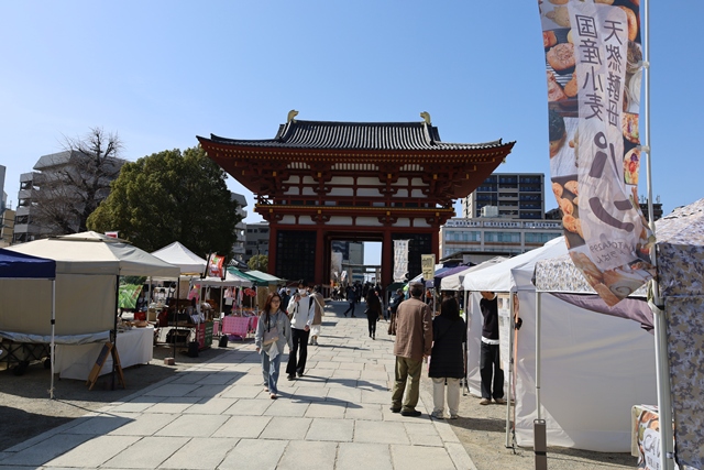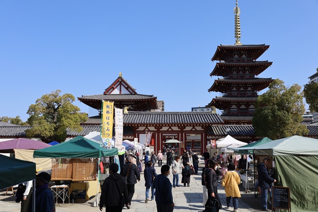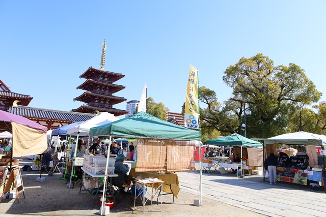 地下鉄谷町線「四天王寺前夕陽ヶ丘駅」から歩いてすぐ。593年に聖徳太子によって建立された和宗総本山・四天王寺の境内(西重門前広場)で開催されるのが「わつか市」です。
