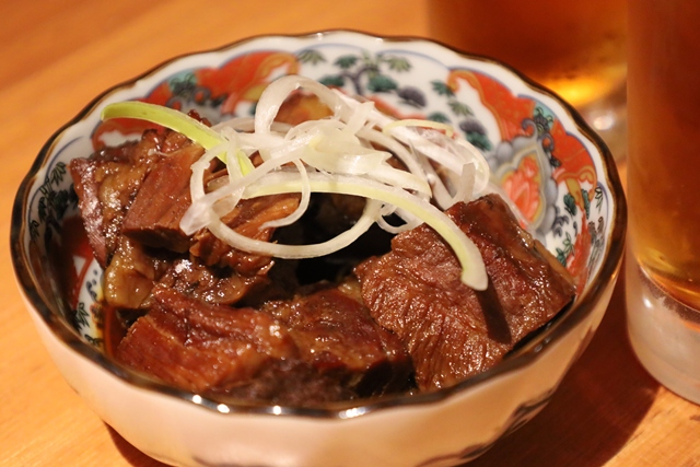 お通しの「角煮」は、口の中でほろほろと解ける柔らかさ。味がしっかり染みていて、これだけでビールが空いてしまうほどの美味しさです。