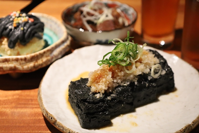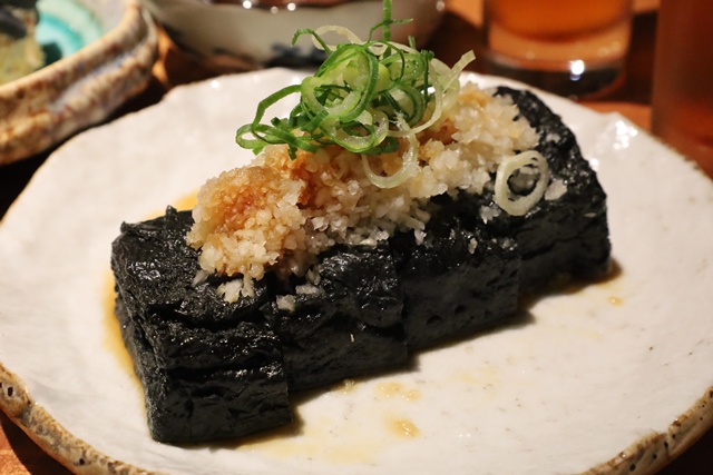 鶏出汁出し巻きは、竹炭を練り込んだ「真っ黒」な見た目がインパクト抜群。鶏出汁の深い旨味がギュッと詰まっています。