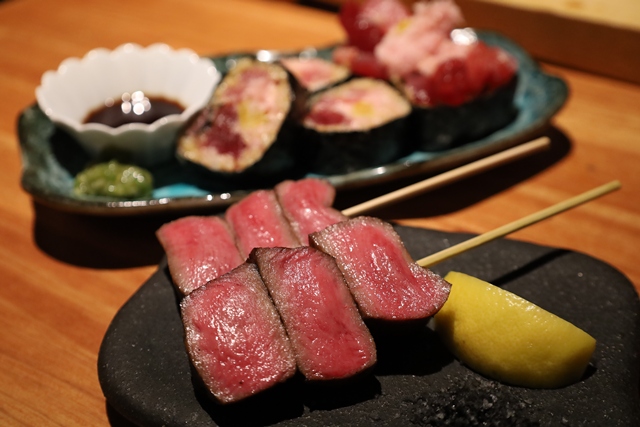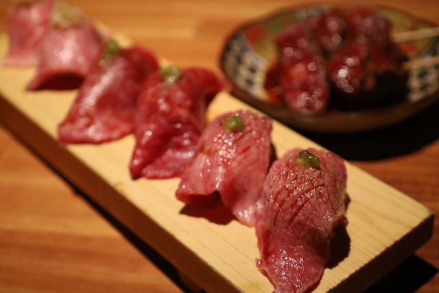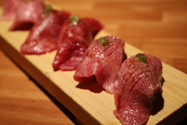 肉寿司3種盛り。希少部位の「ひうち(霜降り)」、とろける甘みの「サーロイン」、赤身の旨味が濃い「しんしん」三者三様の肉の個性が爆発しています。