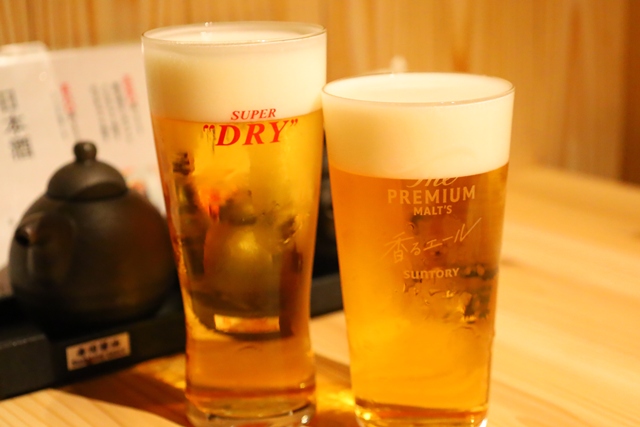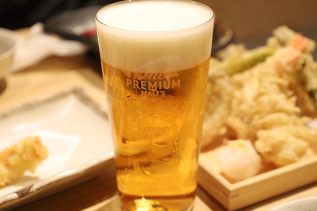 サクサク・アツアツの天ぷらを頬張り、フルーティーな生ビールで流し込む瞬間は、至福の瞬間。アサヒとサントリー、好みの銘柄を選べるのもビール党には嬉しい限りです。