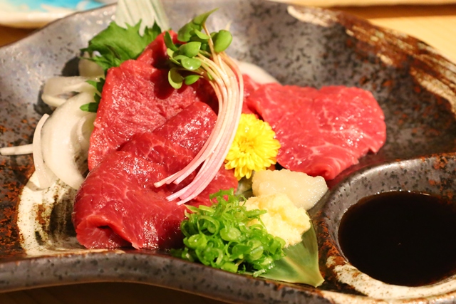 スタッフさん一押しの逸品。熊本から直送されているという馬肉は、生姜とおろしにんにくを入れた醤油でいただきます。