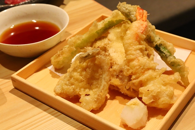 「天ぷら五種盛り」(キス、大海老、アスパラ等)も、衣がサクサクで素材の味が活きています。