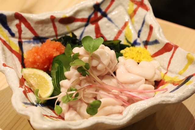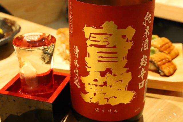 お寿司も中盤に差し掛かり、ここで日本酒へチェンジ。 広島の銘酒「宝剣(ほうけん) 純米酒」をいただいたのですが、これが旬の「鱈の白子」と相性抜群!