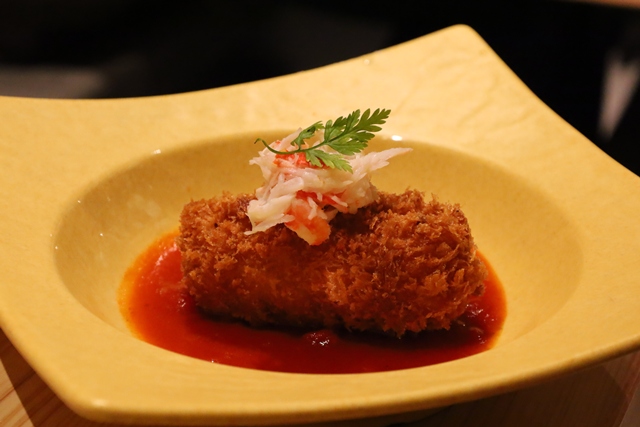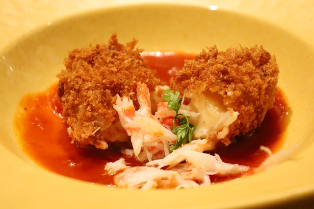 トマトソースの上に、サクサクの衣をまとったコロッケ。中にはとろ〜りクリーム、さらに上にはズワイガニの身がトッピングされています。和食の合間に挟むこの濃厚な味わいは、まさに至福です。