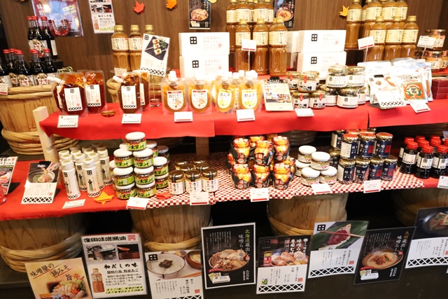お帰りの際は、レジ横の物販コーナーも必見。各地の調味料などが並んでおり、ちょっとした旅行気分でお買い物が楽しめます。