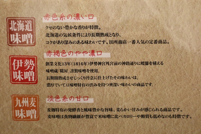 麺場 田所商店では、北海道味噌・信州味噌・九州味噌・伊勢味噌・江戸前味噌などの中から、その土地のニーズや店舗に応じて3種類の味噌を基本として提供されています。