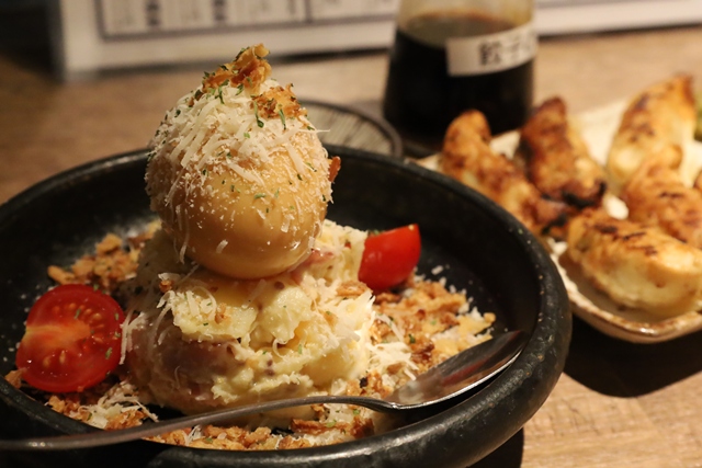 「薩摩芋ポテトサラダ」は、見た目も華やかでまさに名物!上には煮卵、中にはフライドオニオンとチーズが入っており、薩摩芋の甘みとサクサク食感がたまりません。