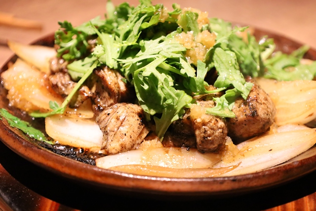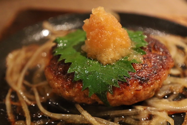 そして、お店の一押しでもある「紫蘇おろしつくね鉄板」。大きく平たいつくねの上に紫蘇と大根おろしがたっぷり。タマネギが敷かれた熱々の鉄板で提供されるので、最後まで温かく、和の味わいに心が落ち着く一品です。
