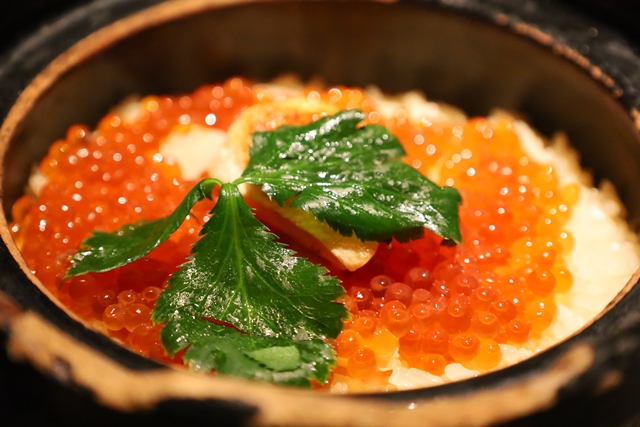 〆には、八代目儀兵衛の特上米と秘伝の出汁で炊き上げた「鮭の親子土鍋めし」を。米、出汁、いくらの組み合わせが最高で、お腹いっぱいでもぺろりと食べられるおいしさです。