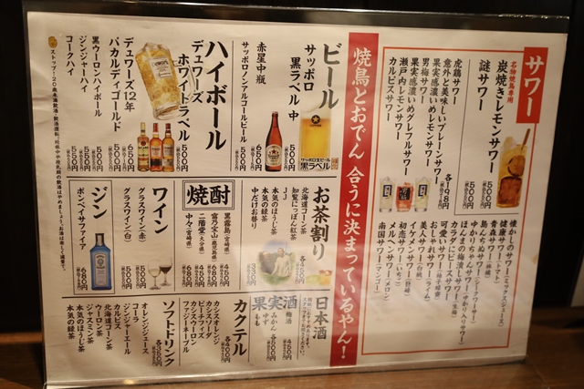 飲み放題サッポロ生ビール、焼き鳥専用ドリンクの「黒ハイ」「白ハイ」をはじめ、焼酎(黒霧島、二階堂など)、種類豊富なサワー、果実酒、ジンまで揃っています。