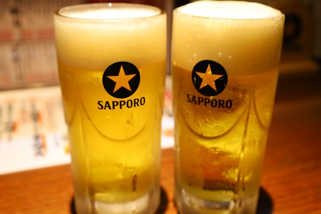 まずは、出汁がしっかりとしみこんだおでんと「サッポロ黒ラベル」で乾杯。心に染みる味わいです。突き出しのサラダがおかわり自由なのもうれしいポイントでした。