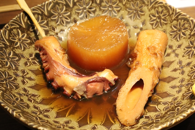 おでんの出汁は、薩摩枕崎産の本ガツオをベースに、土佐清水産の宗田かつお、熊本県牛深産のサバ節とウルメ節をブレンドし、道南産の真昆布を加えるという、天然の素材だけを用いた白だし。健康面にも配慮し、おでんダネそれぞれの旨味を引き出すように丁寧に仕上げられています。