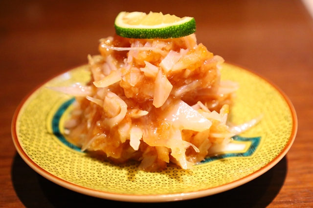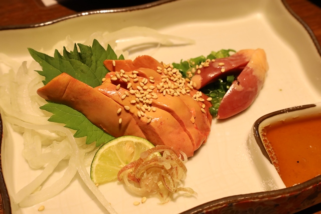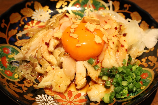 希少な「極み肝刺し~オトギ胡麻油~」がある時限定で提供されていました。その鮮度と濃厚な旨みは、さすが虎鶏ならでは。出会えたら必ずオーダーしたい一皿です。