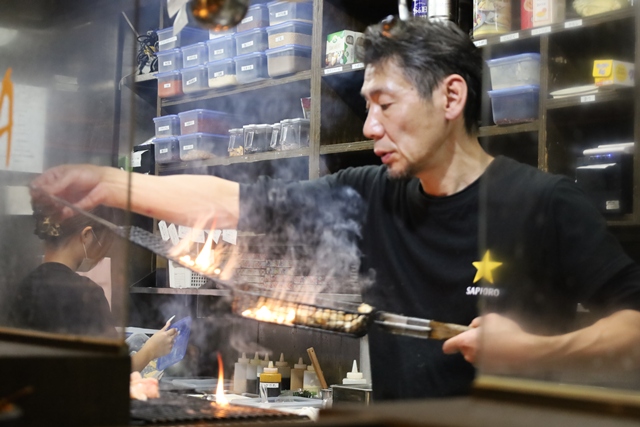 「豊後備長炭」の力。このこだわりの鶏を焼き上げるのは、特有の芳ばしい香りを持つ貴重な炭です。遠赤外線効果により、鶏肉の旨みを中に閉じ込めながら、極上の香りをまとわせます。提供スタイルもユニークで、定番の串焼きではなく宮崎名物の「籠焼き」で提供されるスタイルは、ぜひ一度味わっていただきたい逸品です。