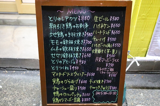 朝引き鶏のお刺身&たたき 毎朝仕入れる新鮮な鶏を、お刺身やたたきで提供。もも、むね、肝など、その日の内容は店内の黒板ボードに書かれています。生姜やワサビ、塩はもちろん、ごま油で食べるとさらに旨みが引き立ちます。