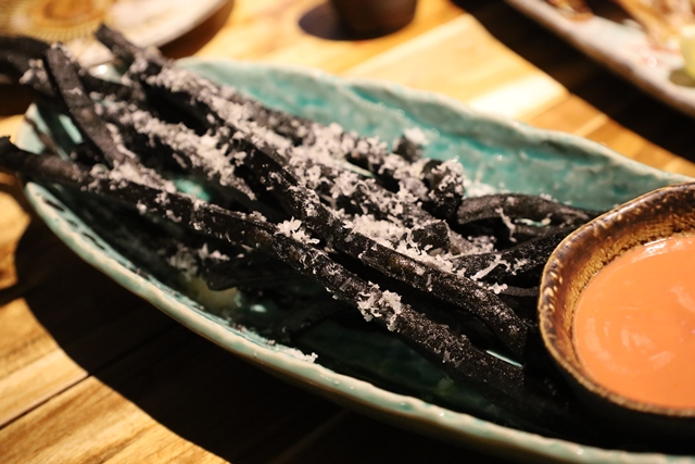 黒いポテトフライは、インパクト抜群!イカ墨を練り込んだロングポテトは、外はサクッ、中はホクホクとした甘みが楽しめます。