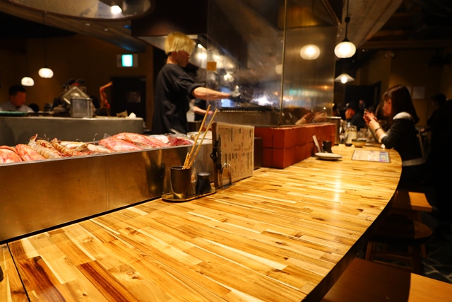店内は、料理人の手さばきを間近に楽しめる臨場感たっぷりのカウンター席と、グループで賑やかに過ごせるテーブル席を完備。