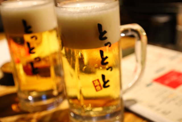注文は自身のスマホからQRコードを読み込むスマートスタイル。まずはサッポロ黒ラベルの生ビールで喉を潤し、至福の時間の幕開けです。