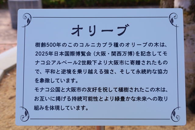 このオリーブの木は、2025年大阪・関西万博のモナコパビリオンで展示されていたものが、ここ鶴見緑地に移植されたものです。