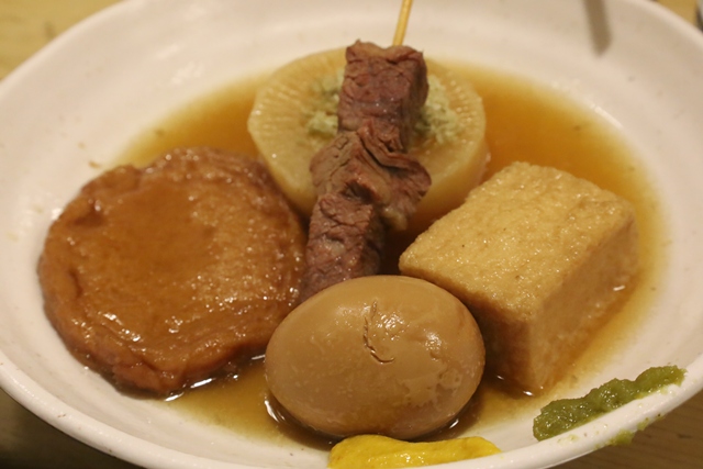 あわせて注文したのは「おでん5種盛り(税込748円)」。大根、牛スジ、厚揚げ、玉子、平天の5種を、からしやわさびでお好みに合わせていただきます。どれもしっかり味が染み込んでいて絶品です!