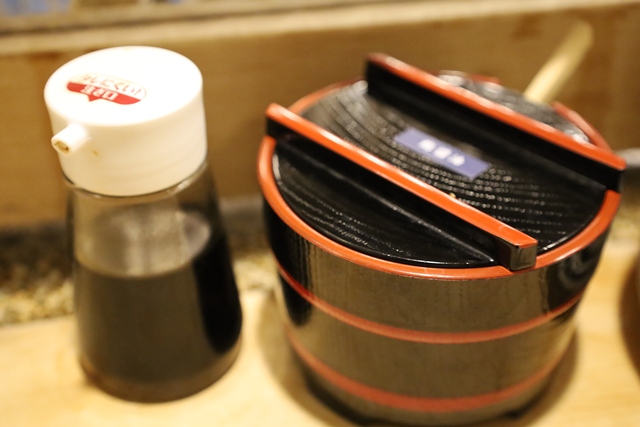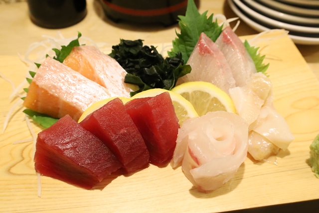 次に提供されたのは「お造り5種盛り」。本マグロの赤身、鯛、粒貝、サーモン、ブリと豪華なラインナップ。醤油が「刺身用」と「寿司用」で用意されているのも、お寿司屋さんならではの細やかなこだわりが感じられて嬉しいポイントです。