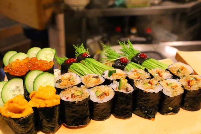 続いては、彩り豊かな巻きものが並びます。 生うににいくら、そして「うな胡巻」。さらに、お寿司の合間や締めにも嬉しい、爽やかな芽ネギまで! 好きなネタを気軽に、かつ一貫ずつしっかり味わえる満足感に、ついお箸が止まりません。